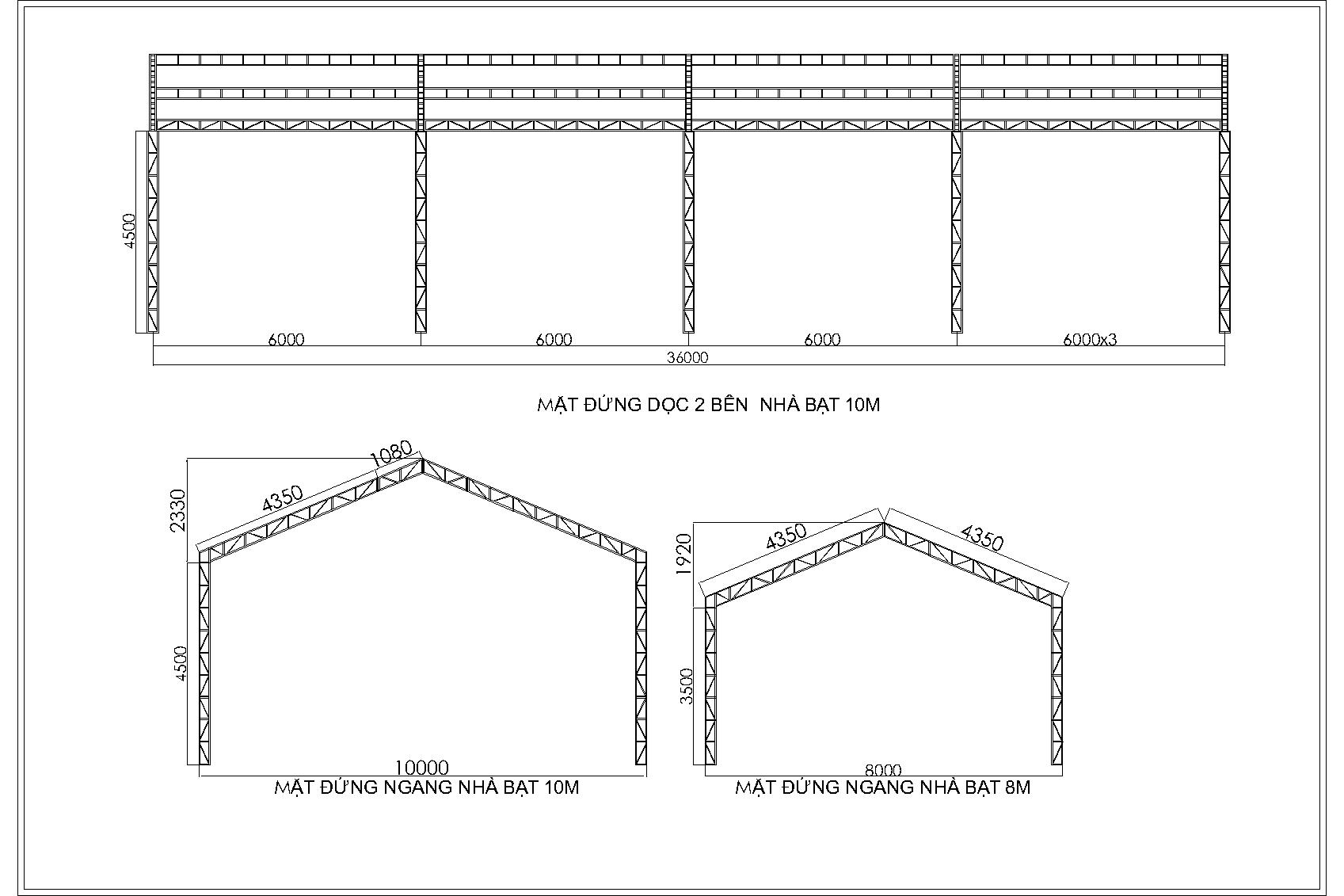 - Kích thước thường dùng cho khung rạp ống tròn đơn giản như 4,5m x3m, 5mx3m... mỗi nhịp là 3m